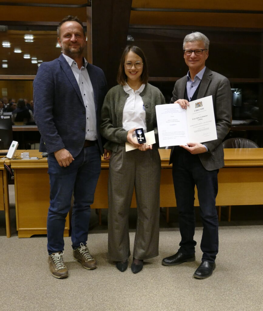 Unter den Geehrten war auch Julia Grabmeier aus Lalling: Für 25 Jahre zuverlässigen Dienst beim Bayerischen Roten Kreuz erhielt sie das Ehrenzeichen für Verdienste um das Bayerische Rote Kreuz. Mit dieser staatlichen Auszeichnung werden Frauen und Männer geehrt, die sich über viele Jahre in Rettungsdienst, Bereitschaften, Wasserwacht oder anderen Diensten des BRK engagieren und damit ein tragendes Fundament der örtlichen Gefahrenabwehr und Hilfeleistung bilden.