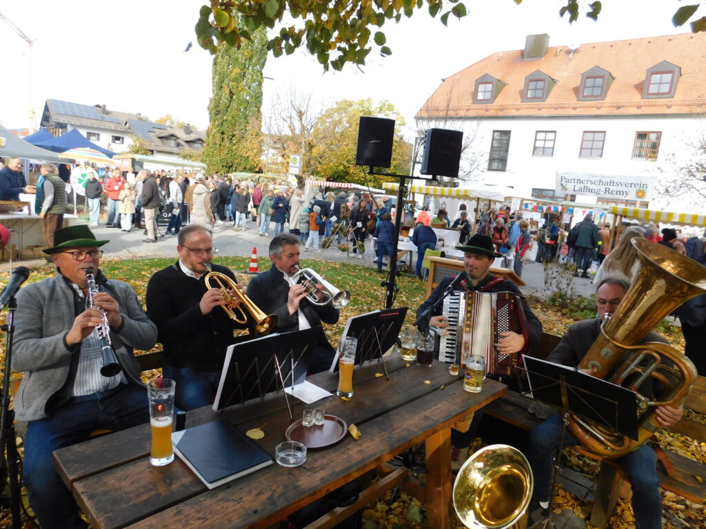 Die Rohrstetter Dorfmusi spielte auf dem Lallinger Dorfplatz unter der großen Linde zünftig zur musikalischen Unterhaltung auf. Im Hintergrund das bereits am Vormittag rege Markttreiben.