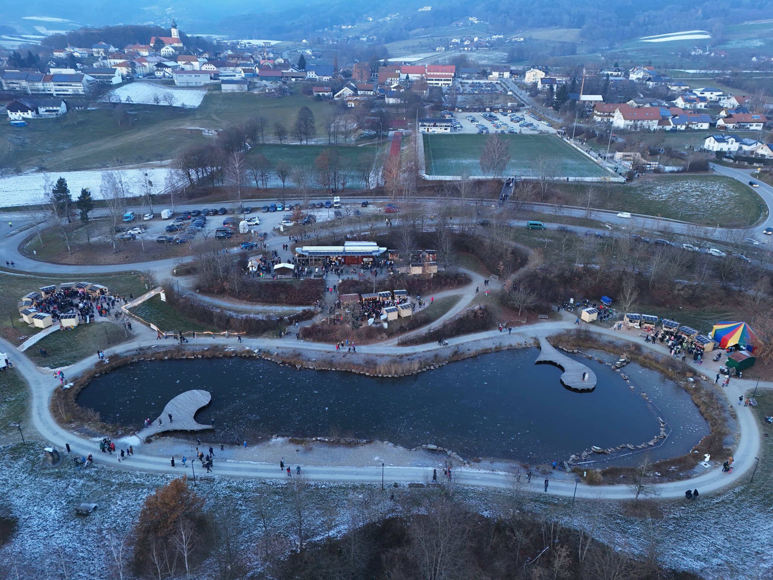 Wie bestellt kam der erste Schneefall im Lallinger Winkel zwei Tage vor dem Wochenende, eine „Punktlandung“ für den Lallinger Wichtelmarkt: Der Besucherandrang um den Kurparksee im Lallinger Feng Shui Park war wieder enorm. Insgesamt warteten rund 40 Verkaufs-, Verpflegungs- und Aktionsstände auf die zahlreichen Besucher. Mit viel Liebe zum Detail waren die Holzhütten mit Lichterketten und vorweihnachtlicher Dekoration versehen. Im Vorfeld war der Lallinger Gemeindebauhof tagelang damit beschäftigt, die Verkaufshütten aufzubauen und die Zuwegungen mit Vlies und Hackschnitzel begehbar zu machen. Bei Christina Fuchs und Anneliese Klampfl liefen in der „Wichtelzentrale“ der Lallinger Tourist-Info die Drähte heiß.